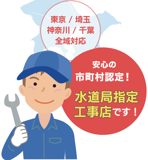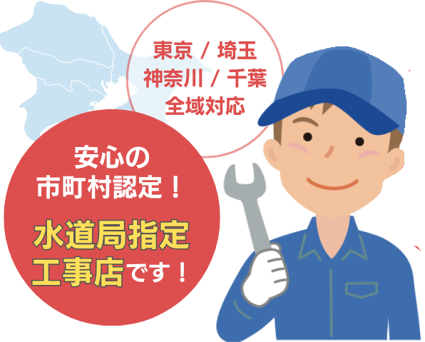 水道局指定工事店は、必要な機材・資材を取り揃えていて、適切な工事と正しい事務手続きを行い、誠実な対応ができると保証されている事業者になります。トイレつまりなどあらゆる水まわりのトラブルに対応可能ですので、安心してご依頼ください。